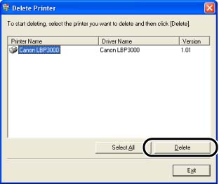 For Windows 98/Me/2000: From the [Start] menu, select [Programs] -> [Canon Printer Uninstaller] -> [Canon LBP3000 Uninstaller].