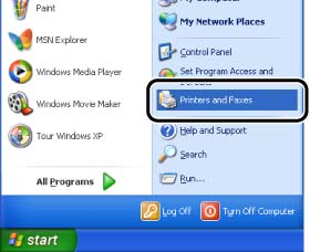 For Windows XP Home Edition: From the [Start] menu, select [Control Panel], and then click [Printers and Other Hardware] -> [Printers and Faxes].