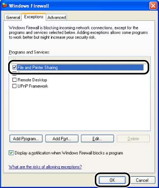 3. In the [Exceptions] sheet in the [Windows Firewall] dialog box, select the [File and Printer Sharing] check box, and then click [OK].