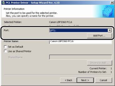 If more than one printer driver is selected, this dialog box will reappear to enable selection of different ports for other printer drivers.