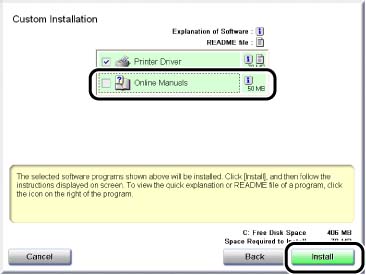 If you selected [Custom Installation] in Step 4, clear the [Online Manuals] check box, and then click [Install].