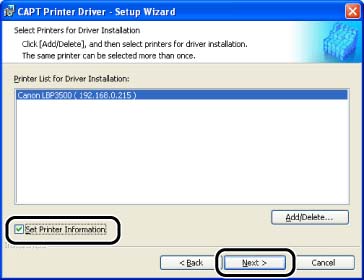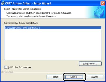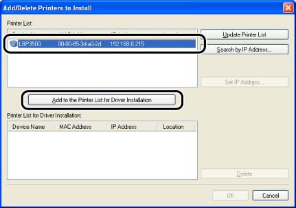 - Select the printer to be installed, then click [Add to the Printer List for Driver Installation].