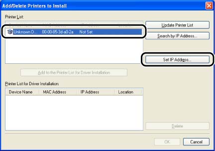 - Select the printer displayed as [Unknown Device], then click [Set IP Address].
