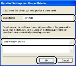 - If you have selected the [Use as Shared Printer] check box, click [Details], and then specify the detailed settings for the shared printer. Change the share name as needed. If there is any computer on which Windows 98/Me runs on the network, select [Intel Windows 98/Me], then click [OK].