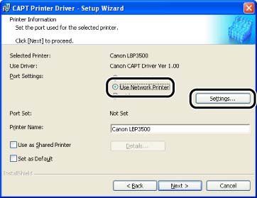 8. Select [Use Network Printer] for [Port Settings], then click [Settings].
