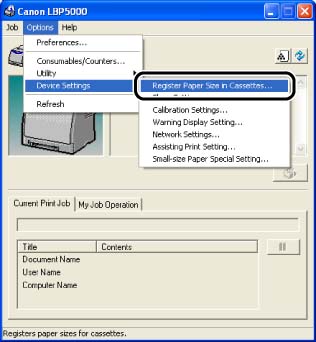 10. From the [Options] menu, select [Device Settings] -> [Register Paper Size in Cassettes].