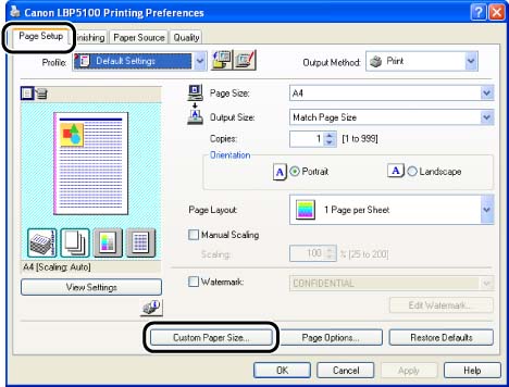 1. Display the [Page Setup] sheet, then click [Custom Paper Size].