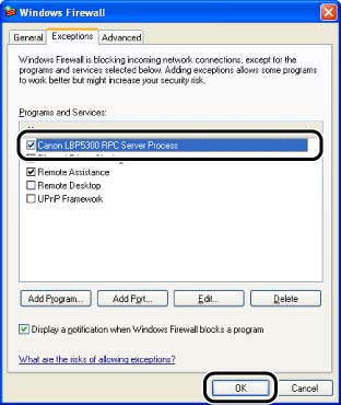 Make sure that the [Canon LBP5300 RPC Server Process] check box is selected in the [Exceptions] sheet in the [Windows Firewall] dialog box.