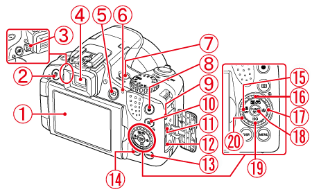 ![]() | (Playback) button | ![]() | (Macro) / (Manual focus) / button |