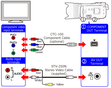 To play back movies in high-definition quality, the camcorder can be connected with the supplied HDMI cable or with the optional component cable and supplied stereo video cable.