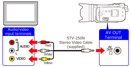 To play back movies in standard-definition, the camcorder can be connected with the supplied stereo cable.