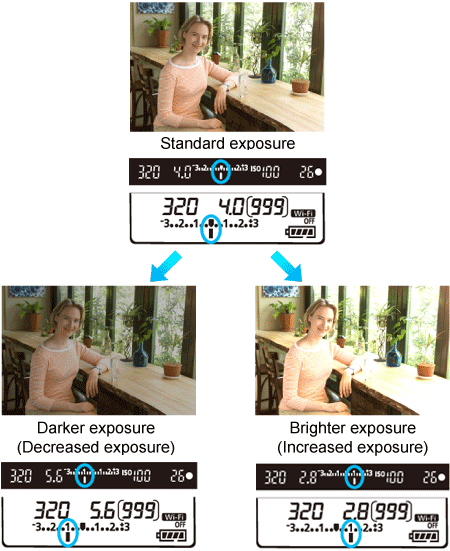 - Although you can set the exposure compensation up to ±5 stops in 1/3 stop increments, the exposure compensation indicator in the viewfinder and on the LCD panel can only display the setting up to ±3 stops. If the exposure compensation amount exceeds ±3 stops, the end of the exposure level indicator will display <