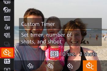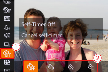 ( ) | The shutter will release approximately two seconds after the camera detects a new face. You can use this when the photographer wants to be in the image, such as a group photo. | - To cancel shooting with the self-timer after the countdown has started, press the < > button.- If the camera cannot detect the face of a new subject that has entered the shot, it will shoot after about 15 seconds later. |