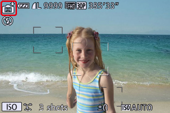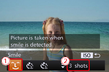 ( ) | Point the camera at a person and press the shutter button fully. The camera will shoot approximately two seconds after it detects a wink. | - If the wink is not detected, wink again slowly and deliberately. - A wink may not be detected if eyes are covered by hair or a hat, or when wearing glasses. - Shutting both eyes will also be detected as a wink. - If a wink is not detected, the camera will automatically shoot after about 15 seconds later. - If there are no people in the shot when the shutter button is pressed fully, the camera will shoot after a person enters the shot and winks. |