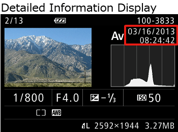 You can confirm the Shooting date and time by switching the display mode to Simple Information Display or Detailed Information Display.