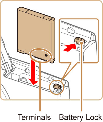 - If you insert the battery facing the wrong way, it cannot be locked into the correct position. Always confirm that the battery is facing the right way and locks when inserted.