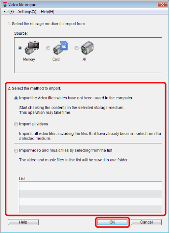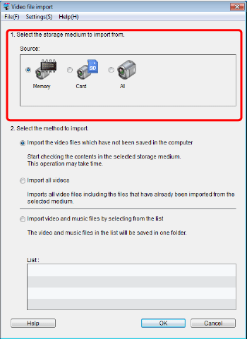 Imports video files included in the list you created in the camcorder and music files. The groups with checkmark will be imported.