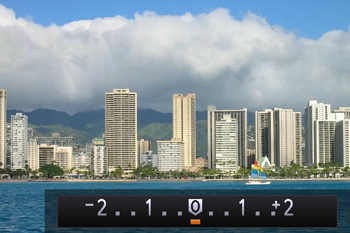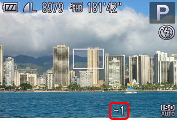 The standard exposure set by the camera can be adjusted in 1/3-stop increments, in a range of –2 to +2.