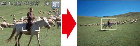 3. Aim the camera so that the subject enters the white frame, and then release the <