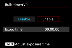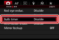 - Doing any of the following will cancel the bulb timer (reverts to [Disable]): Set the power switch to <OFF>, display the movie shooting screen, or change the shooting mode from <B>.