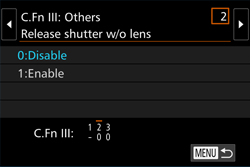 To release the shutter when a lens is not attached, please set the [Release shutter without lens] option in the [Custom Function] menu is set to [Enable] using the following procedure.
