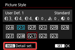 - If a Picture Style has already been registered under [User Def. *], changing the base Picture Style in step 6 will nullify the parameter settings of the registered Picture Style.