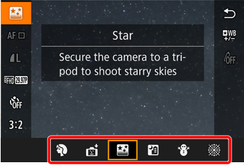 5 ] tab > [Star Emphasis] > [Sharp]. To emphasize the bright stars in a starry sky, set [Star Emphasis] to [Soft]. This setting can produce eye-catching shots by enlarging bright stars while de-emphasizing dimmer stars. To disable starlight processing, select [Off]. - Try switching to manual focus mode to more accurately specify the focal position before shooting.