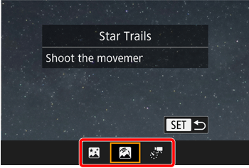 Streaks created by the movement of stars through the sky are recorded in a single image. After determining the shutter speed and number of shots, the camera shoots continuously. A shooting session can last up to about two hours. Check the battery level in advance.