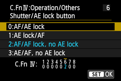 2. Select [6:Shutter/AE lock button] on the [C.Fn IV:Operation/Others], and select [0:AF/AE lock].