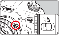 - Set the lens focus mode switch to <MF> and focus by turning the lens focusing ring until the subject looks sharp in the viewfinder. If you press the shutter button halfway during manual focusing, the AF point which achieved focus will flash briefly in red and the focus confirmation light <