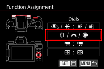 The function assigned to the ring or dials can be changed for individual shooting modes.