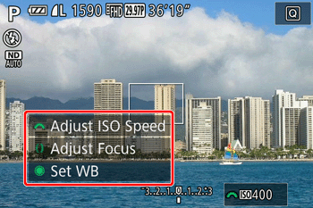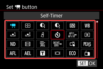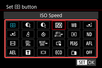 Functions such as ISO speed or image format selection (RAW / JPEG) can be assigned to the <