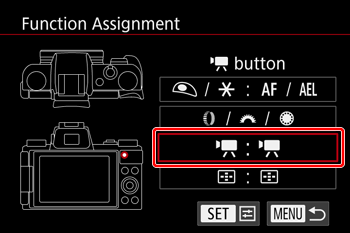 Functions such as ISO speed or image format selection (RAW / JPEG) can be assigned to the movie button. The button can also be set to inactive.