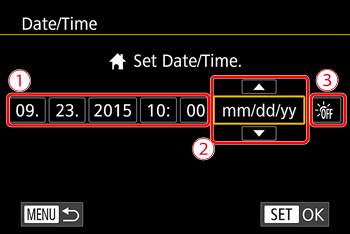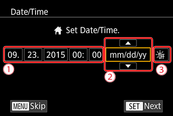 Set the current date and time correctly as follows if the [Date/Time] screen is displayed when you turn the camera on. Information you specify this way is recorded in image properties when you shoot, and it is used when you manage images by shooting date or print images showing the date.