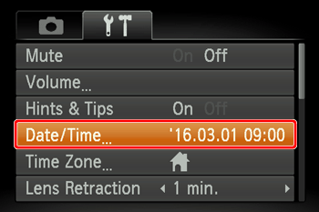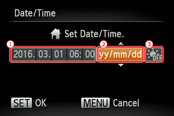 - Unless you set the date, time, and home time zone, the [Date/Time] screen will be displayed each time you turn the camera on. Specify the correct information.