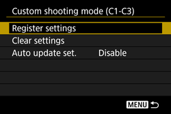 - If you change a setting while shooting in the [ C1 ] / [ C2 ] / [ C3 ] mode, the respective Custom shooting mode can be updated automatically to reflect the change in the setting (Auto update). To enable this automatic update, set [ Auto update set. ] to [ Enable ] in step 4.