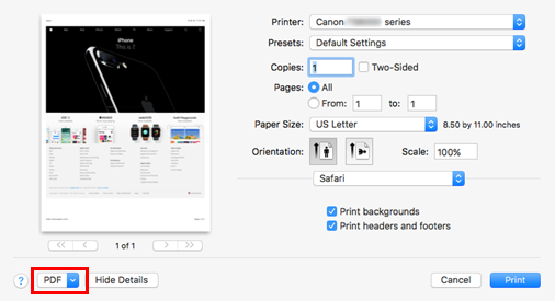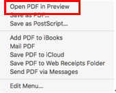 In the Print Dialog, from the [ PDF ] pull-down menu, select [ Open PDF in Preview ].
