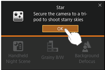 -6 ] tab > [Star Emphasis] > [Sharp]. To emphasize the bright stars in a starry sky, set [Star Emphasis] to [Soft]. This setting can produce eye-catching shots by enlarging bright stars while de-emphasizing dimmer stars. To disable starlight processing, select [Off]. - Try switching to manual focus mode to more accurately specify the focal position before shooting.