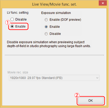 6. The [Live View/Movie func. set.] window appears, so select [Enable] (