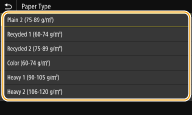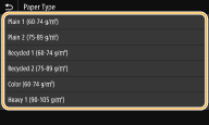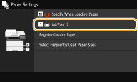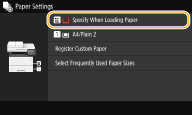 - After the default paper setting is registered, the paper setting screen is not displayed when paper is loaded, and the same setting is always used. If you load a different paper size or type without changing the paper settings, the machine may not print properly. To avoid this problem, select <Specify When Loading Paper> in step 3, and then load the paper.