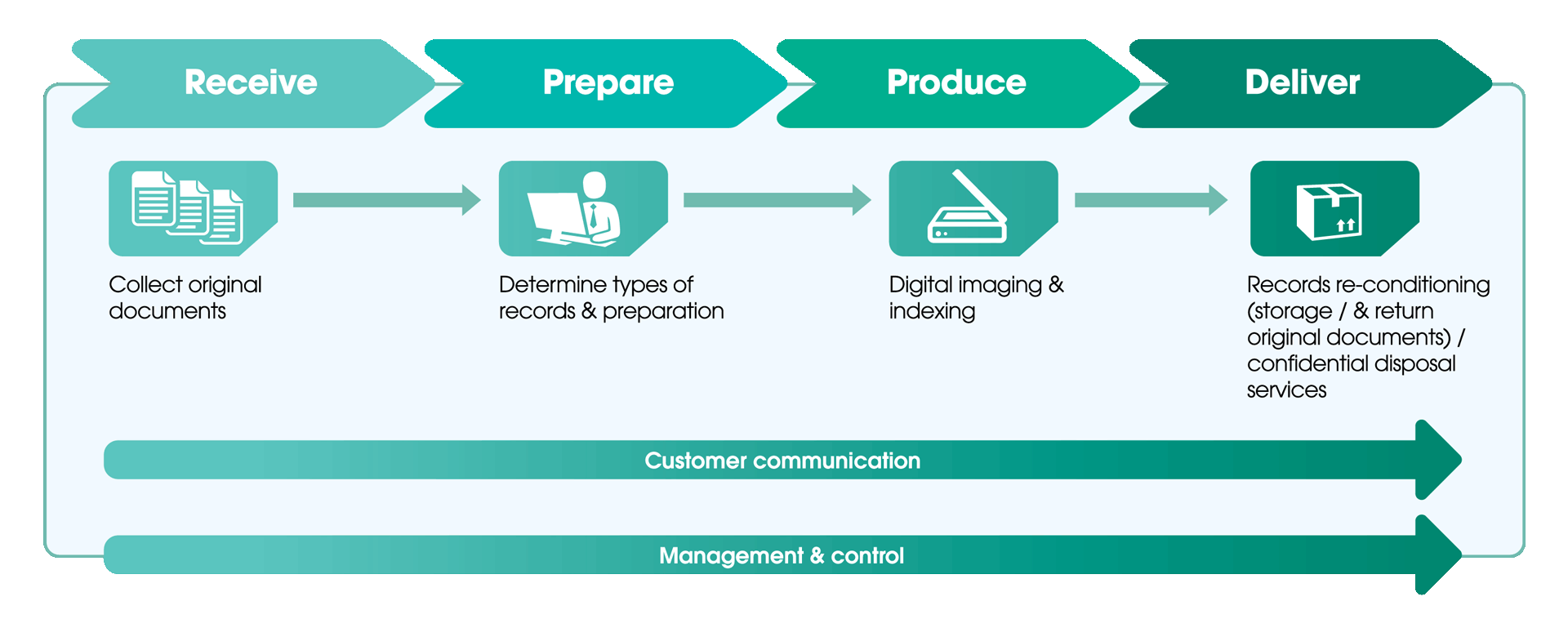 將實體文件備份電仔化,保障文件的內容資訊。服務可根據文件擷取情況及儲存要求、文件掃描的數量,分不同層次實施。