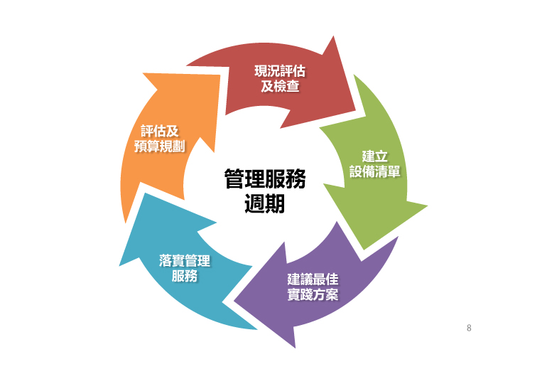 我們的IT管理服務以一個循環的模式運作。我們會先通過對客戶現況進行評估和檢查,再經過詳細研究後,我們將為客戶提供最佳的實踐方案建議。落實服務後,我們亦會定期與客戶對服務結果和成效進行評估,以作進一步微調和改善服務。