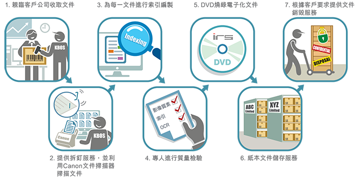 此項服務結合佳能和嘉里物流的優勢,配合佳能先進的器材,及嘉里企業方案全面的設備,為客戶提供一站式的文件管理服務,由掃瞄、分類、記錄儲存、影像建立、運送、品質管理、保密工作等都會一一為你打理。