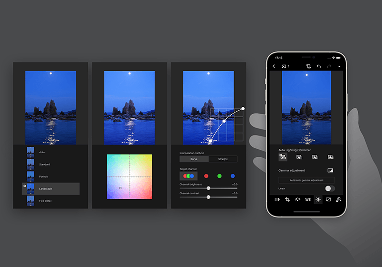 DPP Express 讓您在智能裝置上進行快速直接的操作。透過觸控操作及清晰簡單的用家界面,可以輕鬆在設備上直接調整色調曲線,影像設定,伽瑪曲線甚至鏡頭校正等設定,並即時查看編輯效果。
