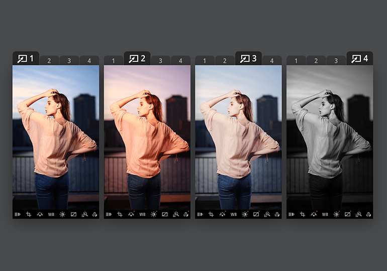 為了創建及比較同一影像的不同編輯效果,DPP Express 提供讓用家瀏覽編輯記錄的功能。此功能有助於比較不同編輯效果,或在作同一影像更改前後的比較。用家可創建多達四個要查看和保存的編輯記錄。