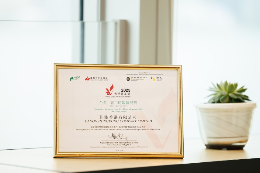憑藉這份持續而充滿熱誠的付出,佳能香港獲頒「香港義工獎2025」之「企業義工時數優異獎」,進一步印證公司在推動企業社會責任方面的長期投入。我們衷心感謝每一位員工的積極參與與無私奉獻,我們期望在未來的日子裡,繼續與社會各界攜手,以行動凝聚善意,共同建設更美好、更有溫度的社區。