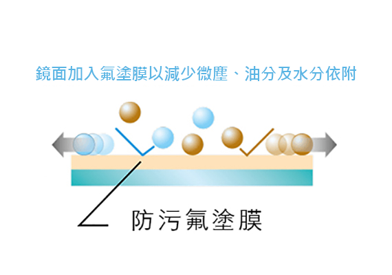 最前端鏡面加入氟塗膜以減少微塵、油分及水分依附。