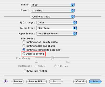 4. 在「列印模式 (Print Mode)」部分中選擇「詳細設定 (Detailed Setting)」選項按鈕。