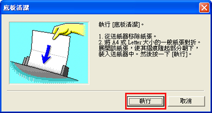 4. 將顯示「底板清潔」對話方塊。按照對話方塊中所示步驟在自動送紙器中裝入一張 A4 或 Letter 大小的一般紙張,並保持打開的一面朝上,折痕朝下。