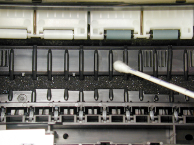 請參閱下面的< 「底板清潔」步驟 >以清除污跡。如果問題仍未解決,請參閱下面的< 如何使用棉花籤清潔印表機內部 > 並使用棉花籤清潔印表機內部。